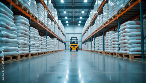 Warehouse forklift & stacked goods on shelves - efficiency