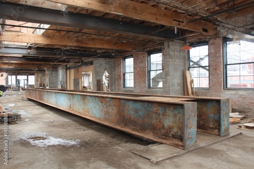 warehouse, interior, construction, renovation, beam, support, metal, steel, brick, wall, window, industrial, building, structure, framework, concrete, floor, wood, ceiling, site, old, aged, rust, corrosion, weathered, vintage, urban, design, architectural, open, space, nobody, repair, material, restoration, project, development