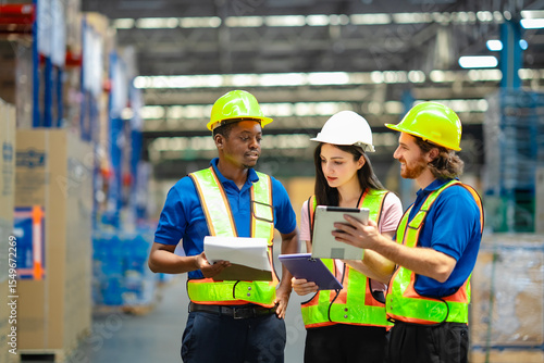 Warehouse professionals in reflective safety vests and helmets discussing inventory with digital tablet and clipboard. Emphasizing teamwork, workplace safety, and efficient supply chain operations.