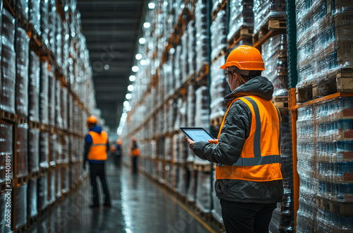 warehouse, men at work, tablet, pallet, stock, industry, logistic, man, safety, helmet, storage, indoor, cargo, distribution, occupation, employee, job, uniform, aisle, shelf, merchandise, good, supply, equipment, factory, business, commercial, interior, working, inspection, technology, digital, looking, concentrated, professional, male, adult, one person, hard hat, industrial, production, fulfillment, center, export, import