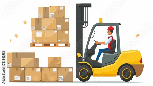Warehouse workers and forklift drivers Forklift carrying pallets with goods in boxes, transportation, moving