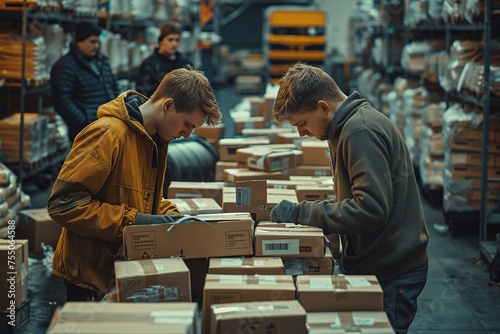 warehouse, men at work, preparing, boxing, delivery, post office, shipping, parcel, package, logistic, distribution, cardboard box, packing, postal service, mail, sorting