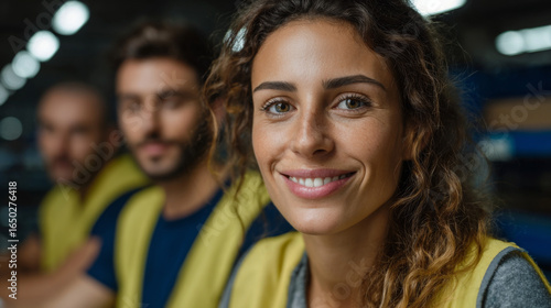 Warehouse Workforce: A close-up shot showcases a smiling woman worker radiating confidence, and focus within a dynamic warehouse. The image captures the vibrancy of modern production.