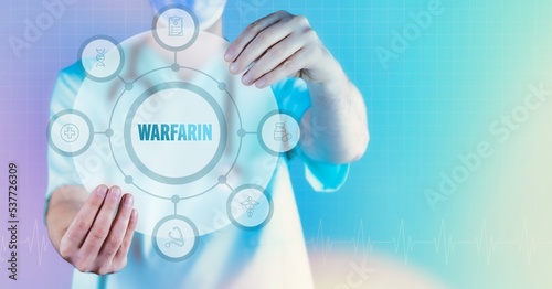 Warfarin. Medicine in the future. Doctor holds virtual interface with text and icons in circle.