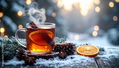 Warm and cozy Christmas still life with tea, pine, and festive atmosphere for lifestyle visuals.
