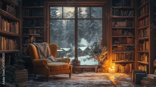 Warm and cozy vintage chair in a candlelit study, wooden bookshelves, massive window showing a snowy village outside