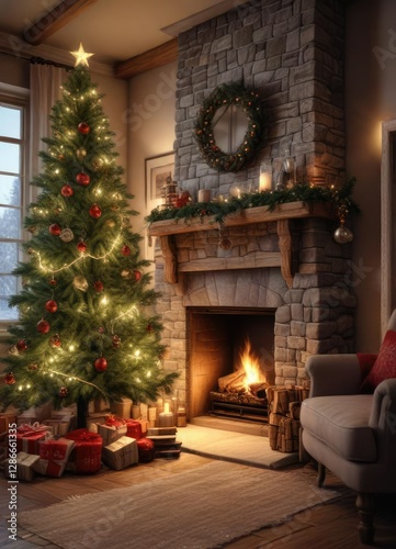 Warm and cozy winter scene with a Christmas tree placed near a crackling fireplace , cabin, winter wonderland, christmas tree