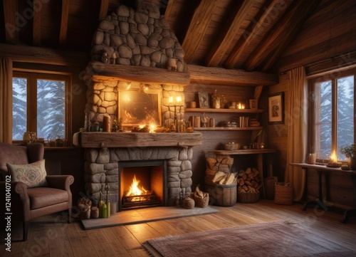 Warm and crackling fireplace in a rustic wooden cabin, inviting, cozy, earthy