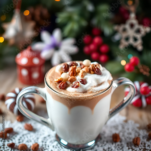 Warm and inviting hot chocolate topped with whipped cream and nuts on a festive background during the holiday season