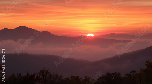 Warm autumn colors, vibrant sunset over majestic mountain range, thick foggy surroundings, low visibility, thick fog, earthy and cozy, muted tones.