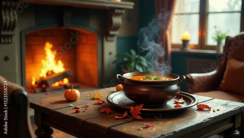 Warm autumnal evening featuring a steaming bowl of soup by a cozy fireplace