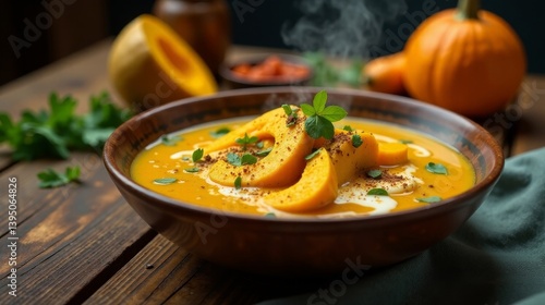 Warm autumnal pumpkin soup, garnished with creamy swirls and spiced pumpkin slices, served in rustic bowl on wooden table