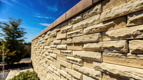 Warm beige sandstone brick wall with horizontal texture in a rustic outdoor setting