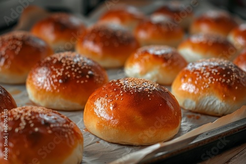 Warm buns cooling on a baking sheet, just baked and ready to savor