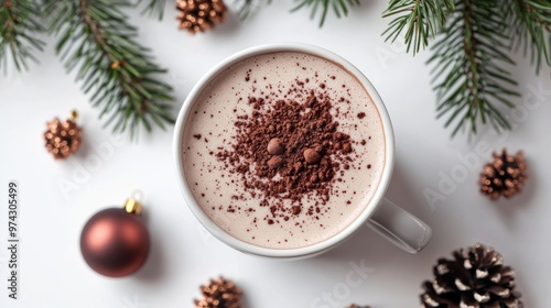 cocoa, hot, chocolate, cup, drink, christmas, holiday, winter, feast, pine, tree, tree branch, ornament, decor, festive, brown, white, background, cosy, warm, delicious, sweet, sprinkled, powder, cinnamon, whipped, cream, happy, celebration, joy, comfort, relaxation, season