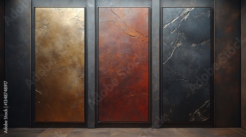 panel, wall, texture, metallic, gold, bronze, copper, rust, stone, dark, grey, black, brown, orange, red, surface, material, design, interior, decoration, architecture, background, abstract, art, modern, contemporary, elegant, luxurious, rich, glossy, matte, finish, pattern, veined, natural, industrial, rustic, smooth, rough, polished, unpolished, vertical, rectangular, frame, display, showcase, style, aesthetic, colours