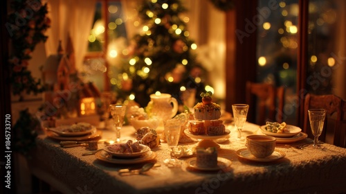 family, table, setup, warm, light, scene, dinner, celebration, holiday, cosy, indoor, decor, atmosphere, food, dessert, drink, dish, cheer, togetherness, joy, elegant, gathering, rustic, inviting, festive, ambience, dining, arrangement, glassware, cutlery, candlelight, evening, party, treat, sweet, cheerful, decoration, friends, warmth, moment, love, happiness, memory, holiday spirit, festivity, home, relaxation