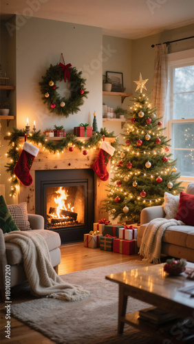 Warm festive Christmas living room with decorated tree glowing fireplace wreath stockings garlands and gifts