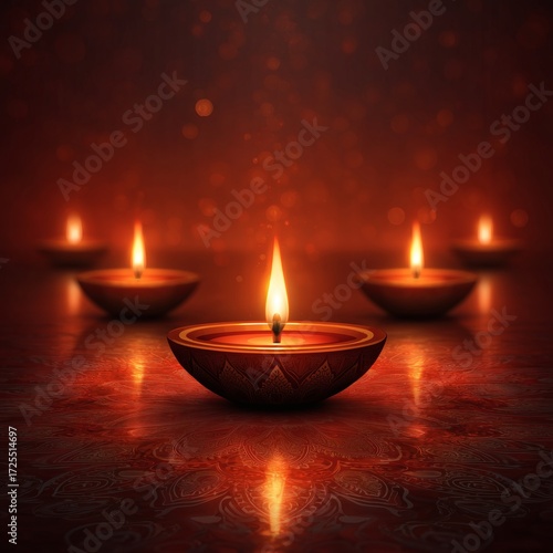 Warm glow of traditional diyas illuminates a festive ornate surface creating an ambiance of celebration and spiritual serenity