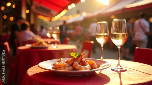 warm golden light spills rustic red table adorned steaming plate boiled white prawns two chilled manzanilla fino glasses