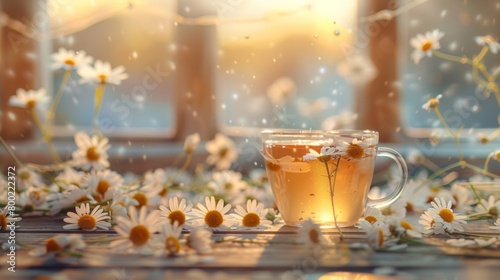 Warm herbal tea in a transparent mug surrounded by fresh daisies on a wooden surface with sunlight.