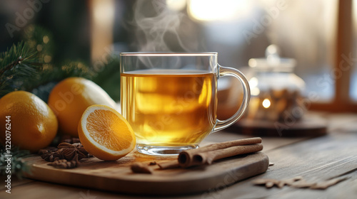 Warm herbal tea with lemon and spices on wooden table, evoking comfort and relaxation. Perfect for cozy moments