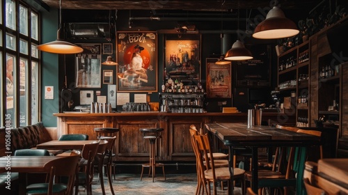 Warm, inviting bar with soft pendant lights, classic posters, and a cozy seating arrangement, perfect for an intimate social space