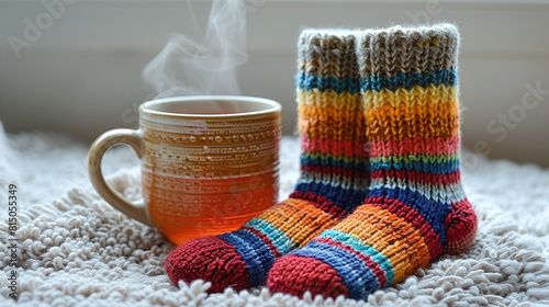 sock, mug, tea, cosy, winter, warm, colourful, knitwear, comfort, steam, hot drink, hand-made, wool, many-coloured, relaxed, snug, beverage, home, indoor, breakfast, morning, craft, texture, casual attire, lifestyle, peaceful, homemade, soft, fabric, crafted, leisure, table, threaded, knit up