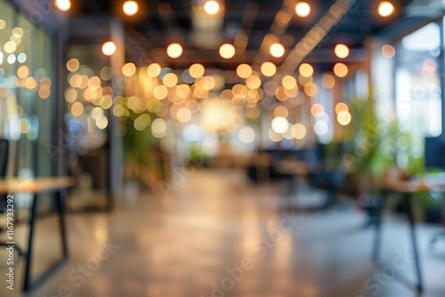 Warm lighting illuminates a blurred modern office space, creating a cozy and inviting atmosphere.