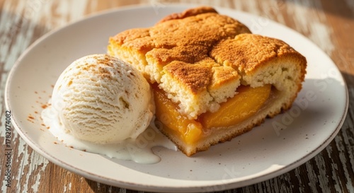 dessert, peach, cobbler, fruit, pie, vanilla, ice, cream, crumble, baked, good, pastry, cinnamon, sweet, treat, filling, scoop, gold, brown, yellow, white, crumbly, smooth, gooey, rustic, closeup, delicious, appetising, warm, melting, food, photo, comforting, wooden, table, distressed, wood, ceramic, plate, natural, light, sunny, indoor, slice, homemade, crust, dusted, summer, comfort