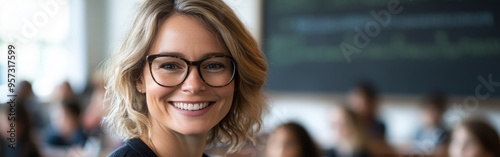 Warm Smile of a Cheerful Teacher in a Lively Classroom