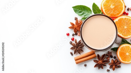 milk, tea, spiced, citrous, spice, white, background, beverage, drink, warm, comfort, autumn, winter, cinnamon, star, anise, orange, slice, nutmeg, cardamon, vanilla, clove, aromatic, favor, rich, tasty, hot, cosy, refreshment, mug, ceramic, table, top, view, isolated, home, comforting, seasonal, epicure, traditional, delicious, aroma, preparation, serving, indulgent, nourishment, wellness