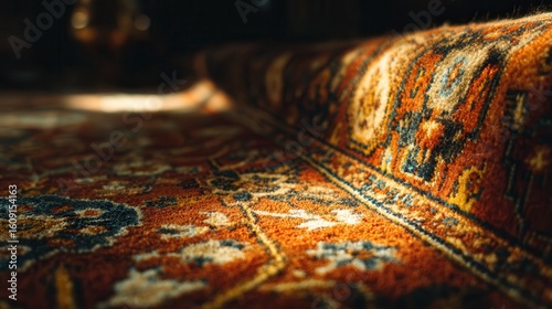 Warm sunlight casting shadows on a vintage intricately designed rug in a cozy living room setting
