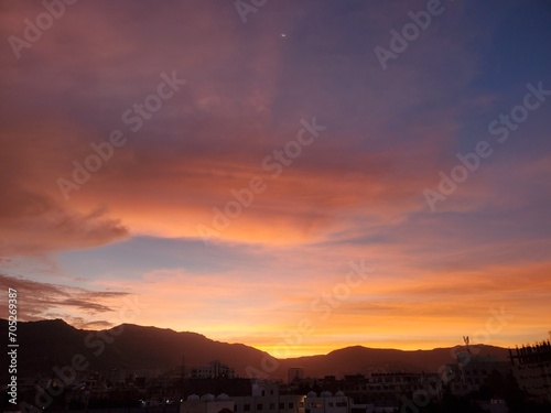 Warm sunset view on the horizon behind the mountains in the city