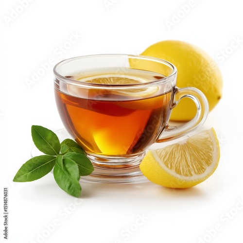 Warm tea with fresh lemon slices in a clear cup on a bright white background ideal for a cozy afternoon drink or refreshing beverage option