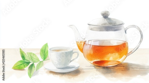 Warm teapot and steaming cup, a cozy tea time setting for relaxation enjoyment