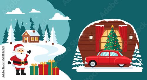 Warm Winter Greetings From A Cozy Cabin With A Festive Tree, A Charming Santa Claus With Gifts And A Classic Car For A Joyful Holiday Season