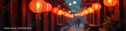 Warm wood, paper lanterns, noren curtain, glowing sign, sign, architecture, lantern