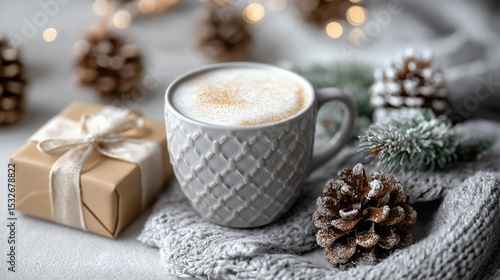Warme Kaffeeszene mit Geschenken und gemütlicher Weihnachtsdekoration