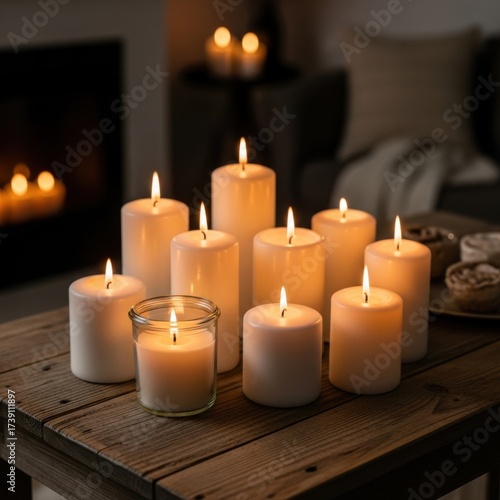 Warmth and serenity: Lit candles adorning a rustic wooden surface