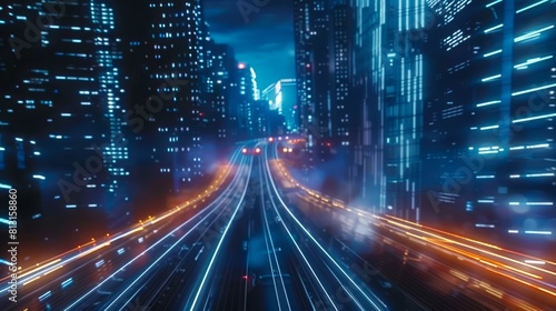 Warp speed in hyper loop with blur light from buildings' lights in mega city at night. Concept of next generation technology.
