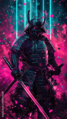 warrior, armoring, sword, neon, light, flower petals, fantasy, samurai, silhouette, dark, vibrant, culture, hero, battle, art, illustration, dramatic, colourful, mystical, strength, power, tradition, fighting, epic, character, motion, energy, background, artistry, historical, adventure, creativity, nature, design, visualisation, shadow, ceremonial, impact, mystery, emotion, visual, concept, story, dynamic, aesthetic