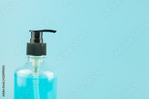 wash hand sanitizer gel bottle on blue background, against Novel coronavirus or Corona Virus Disease (Covid-19). Antiseptic, Hygiene and Healthcare concept