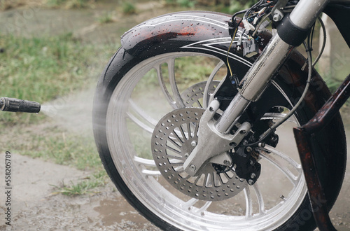 motorcycle, clean, wheel, water, dirt, engine, body, bike, high pressure, head, service, garage, vehicle, laundered, transportation, transport, hand, person, foam, shop, mechanic, motorbike, people, cleaner, care, towel, rear, drying, shine, soap, closeup, ride, rub, detail, wipe, machine, remove, work, young, headlamp, biker, polishing, adult, dirty, mature, clothes