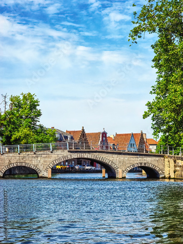 Water canal in Bruges, Belgium showing the bridges to which the city ows its name.