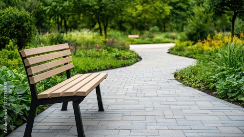 Water conservation gardening idea. A tranquil park scene with a wooden bench along a winding pathway and lush greenery.