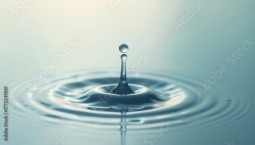 Water drop impact on calm surface. Ball shaped water drop above surface. Concentric ripples are created. Calmness and purity are showcased in water splash. Minimalism concept is displayed.