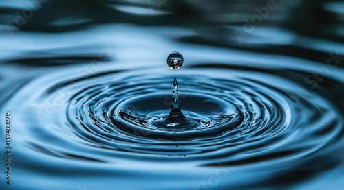 Water drop impacting a dark blue surface, creating ripples