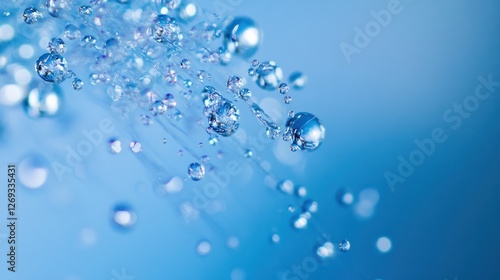 Water droplets falling, blue background, purity concept, ad