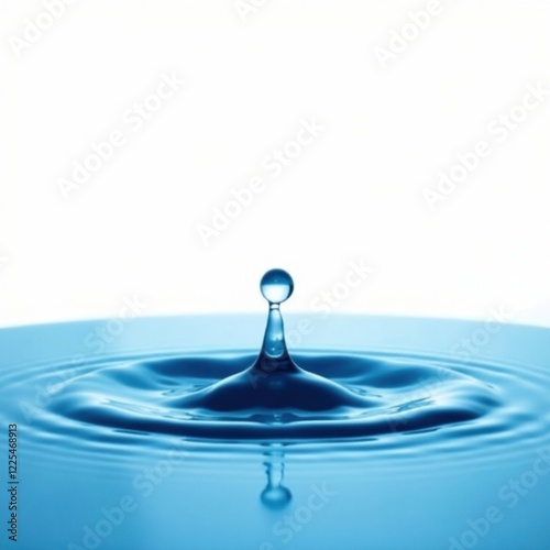 Water droplets falling into blue water on a white background, ripples, calm, peaceful